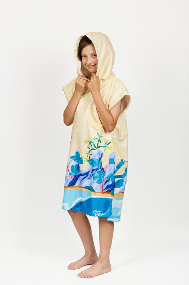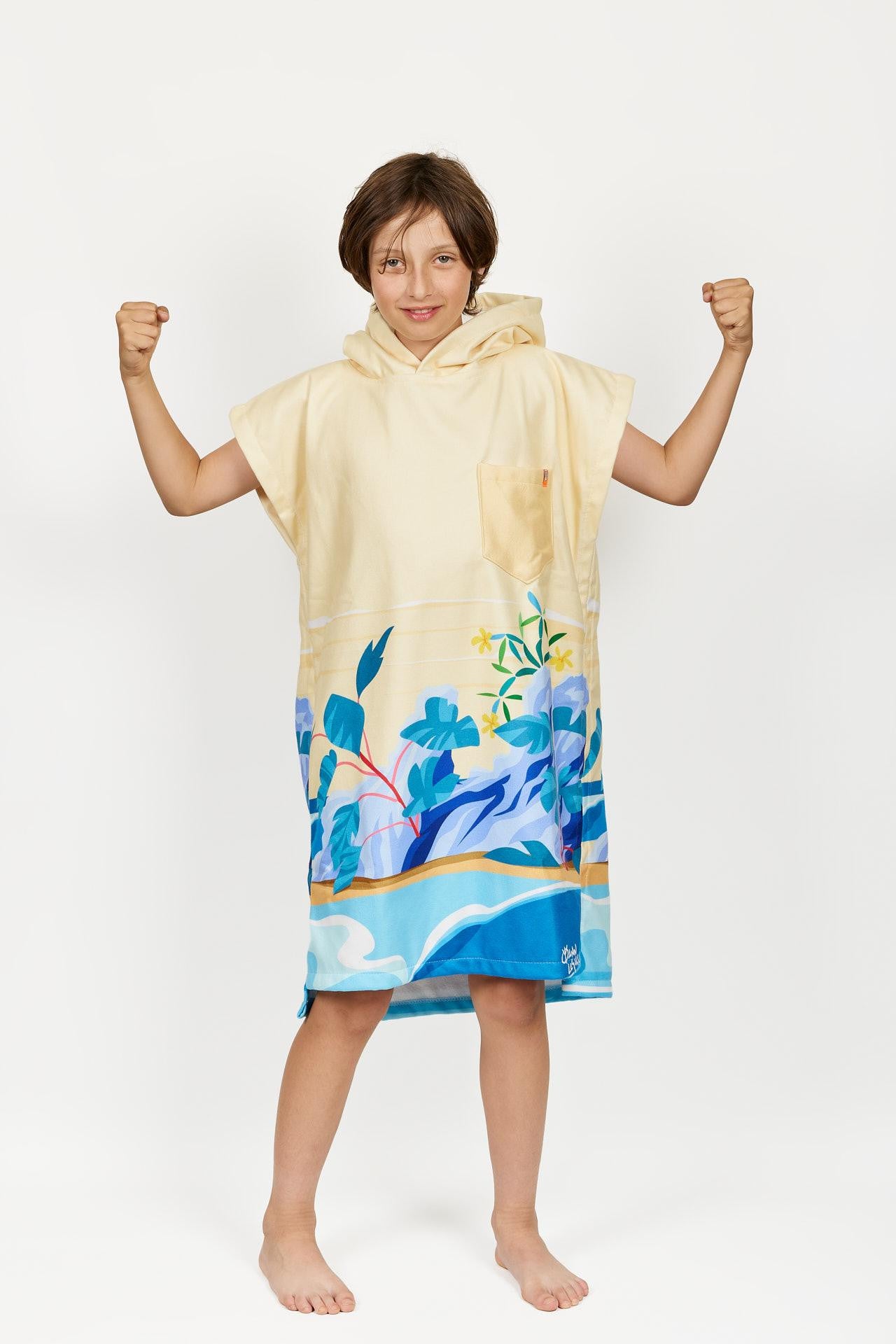 Ce poncho enfant est une collaboration avec Yann Le Gall, graffeur réunionnais passionné de bodyboard. Inspiré par les paysages tropicaux et la culture de La Réunion, son design coloré mêle vagues, plages et motifs locaux.