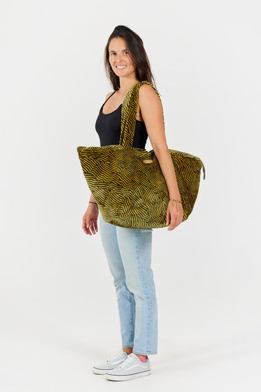 Die Sofa Bag Wish zeigt neu interpretierte gelb-schwarze Streifen und vereint Street-Einflüsse mit Outdoor-Spirit. Gefertigt aus dicker, zu 100 % recycelter Fleece, verbindet sie Stil und Funktionalität mit ihrem großen Fassungsvermögen, der breiten Öffnung und der kleinen Reißverschlusstasche im Inneren. Ein mutiger Shopper für Ihre Tage in der Stadt.