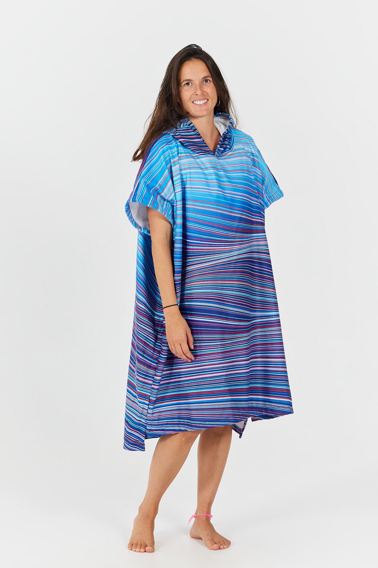 Confectionné avec un extérieur en polyester 100 %, le poncho est léger et met en valeur l’œuvre par sublimation. Sa coupe oversize et ses larges ouvertures latérales le rendent facile à enfiler, tandis que la doublure en éponge de coton 100 % et la capuche généreuse apportent chaleur et douceur après une session de surf, une baignade ou toute autre activité nautique.