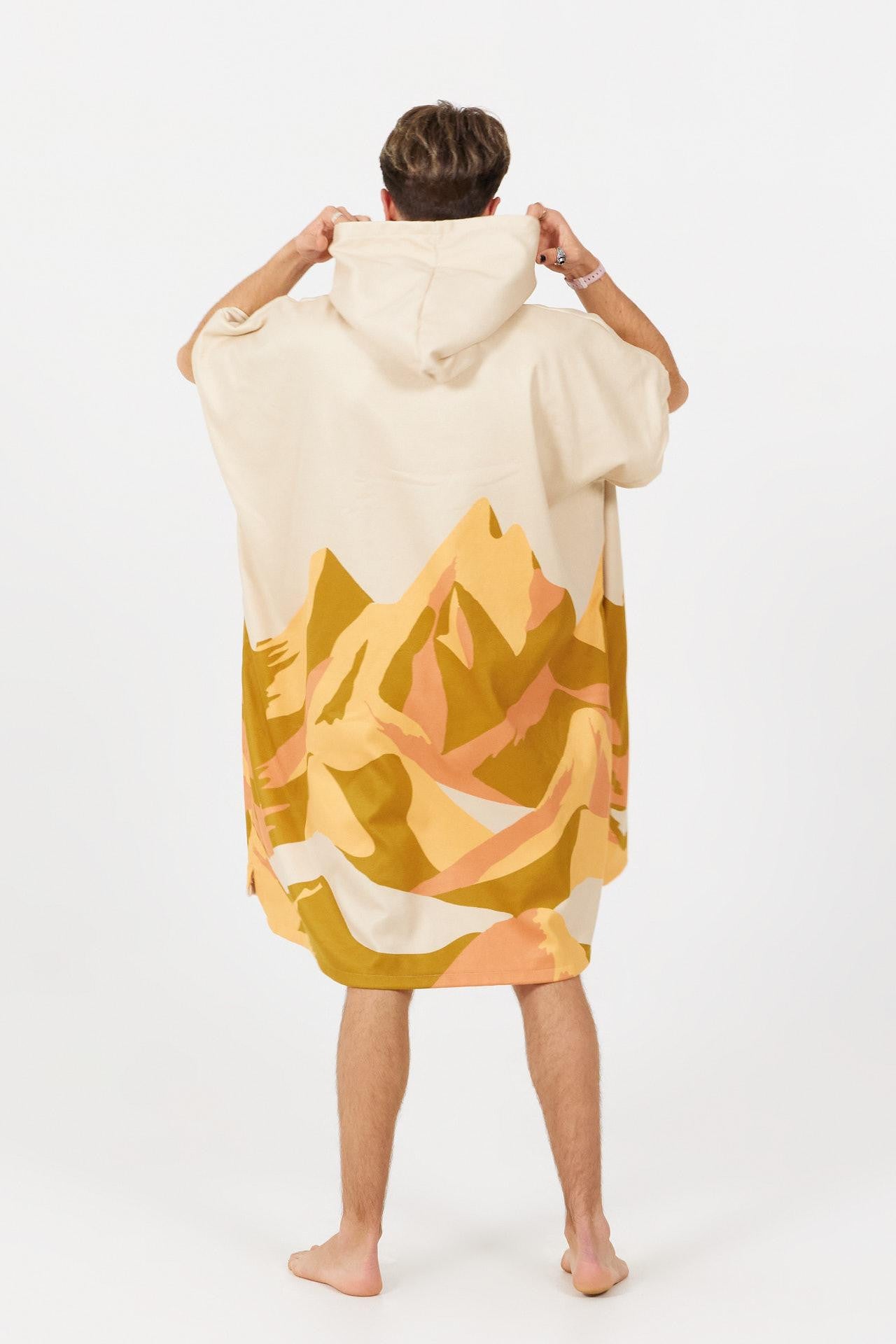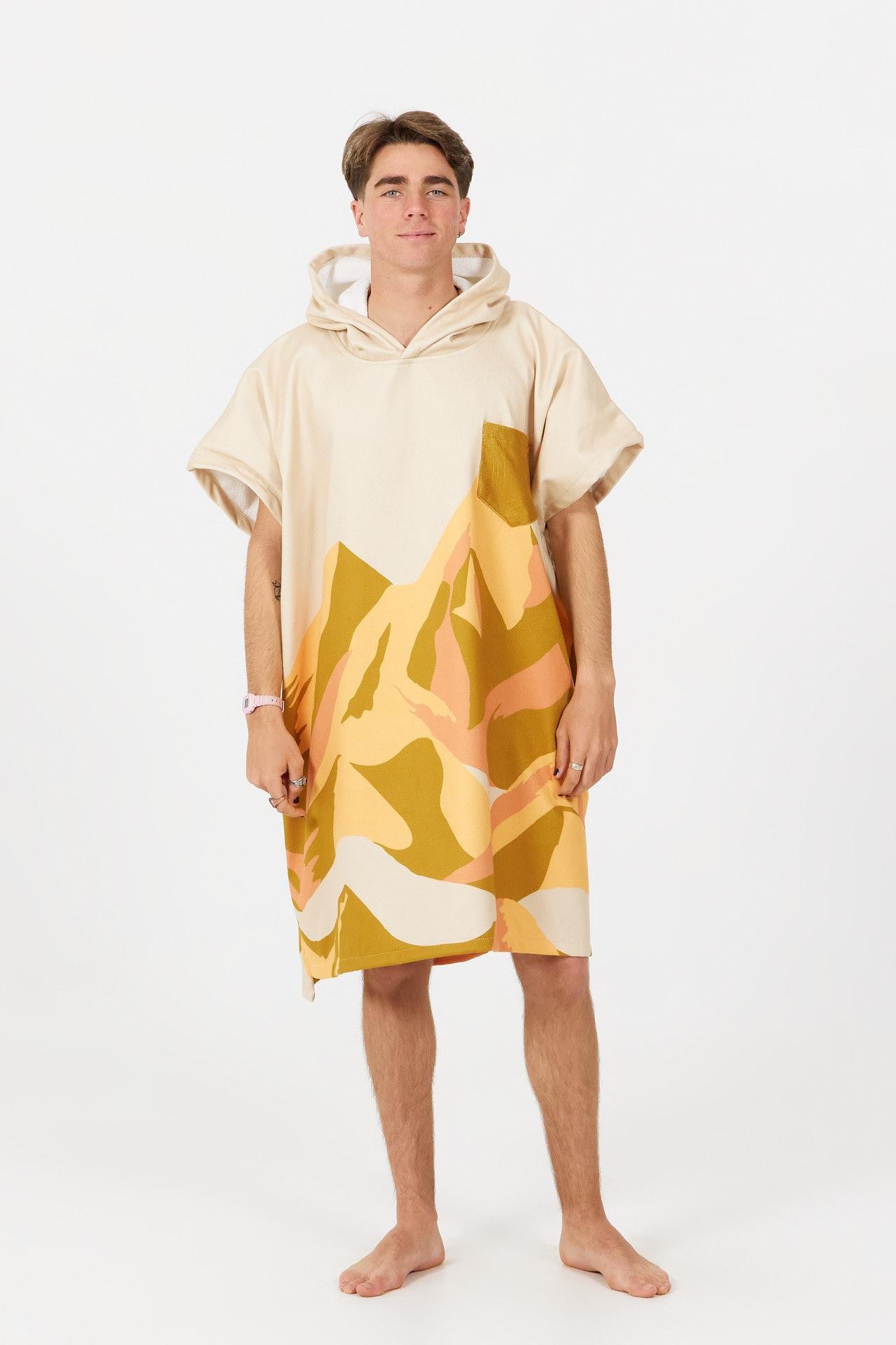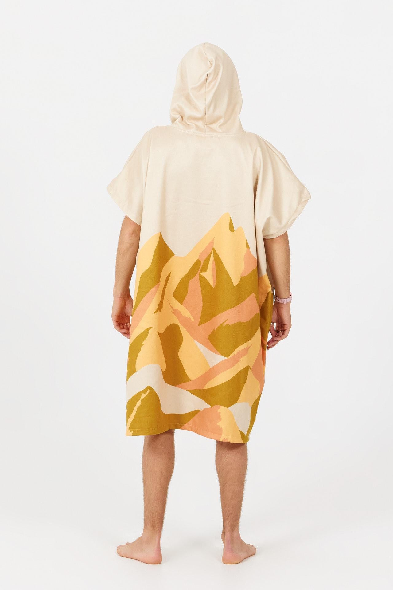 Inspiré par les cimes et les grands espaces, ce poncho aux motifs de montagnes stylisées et aux teintes naturelles t’accompagne partout : après une baignade, une rando ou une journée aux thermes.