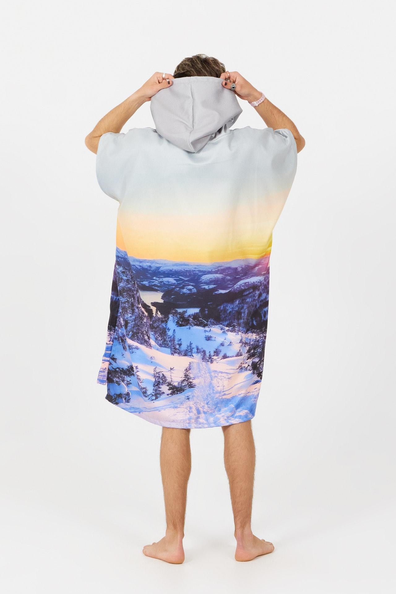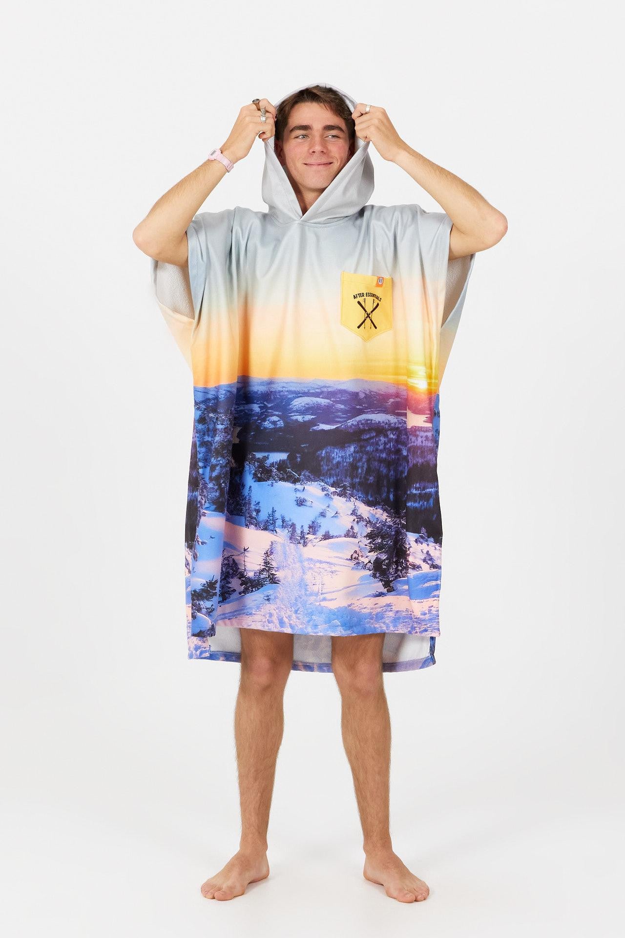 Entre lumière et froid, ce poncho évoque les couleurs et l’énergie des matins scandinaves. Confectionné en tissu éponge ultra absorbant, il te garantit chaleur et confort après une baignade, une randonnée ou une pause en pleine nature. Sa coupe ample et sa capuche enveloppante facilitent l’enfilage, tandis que ses ouvertures latérales pratiques te permettent de te changer rapidement, même en extérieur.